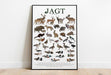 Plakaten giver et overblik over jagtbare vildtarter, man må jage i Danmark – illustreret med smukke og naturtro billeder, så du nemt kan kende forskel på arterne i felten. En både lærerig og dekorativ plakat for enhver jæger eller naturinteresseret.