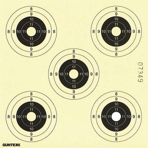 14*14 cm. Papirskiver som passer til Pellettrap. Multi Paper Targets 2,5 5 og 7,5 cm, gul, sort og rød, 10 stk. Selvklæbende, selvmarkerende mål.