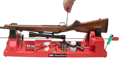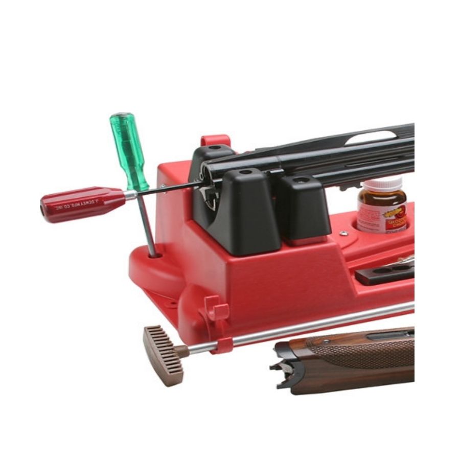 Med denna verkstadsbänk från MTM får du en solid plattform att ta hand om och ta hand om ditt vapen. Bänken är gjord av rejäl plast, så vikten är minimal, och den innehåller även flera fack där du kan förvara din underhållsutrustning, som borrsnoke, skruvmejslar och olja. Vapnet kan även låsas till bänken, för bättre stabilitet.